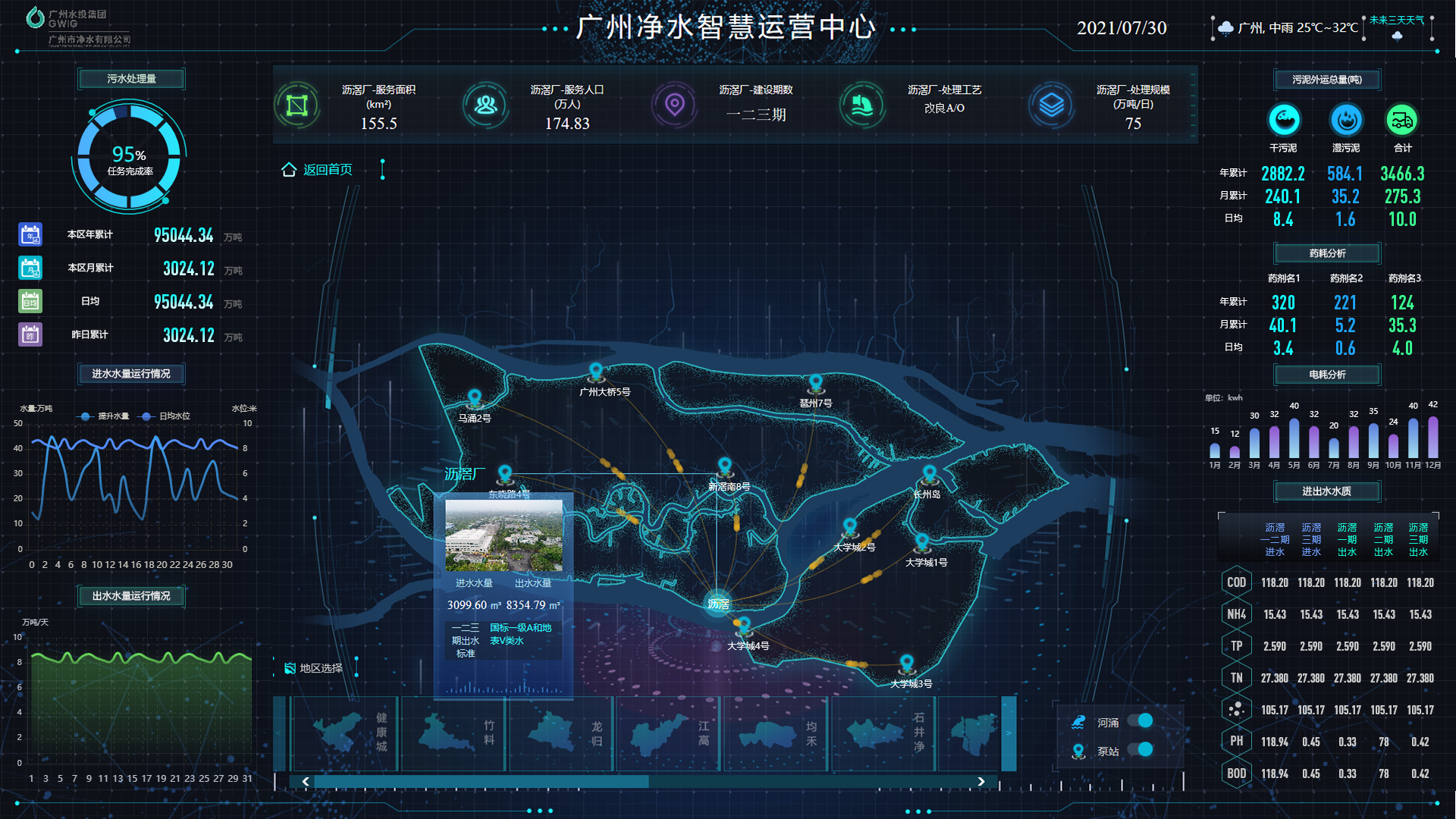通过集成水质检测、传感器等设备,对广州市民饮用水水质、水厂进行实时监测,通过可视化方式,呈现到系统中,便于运营人员及时发现和处理异常问题,有效的减少运营成本、提供运营效率。