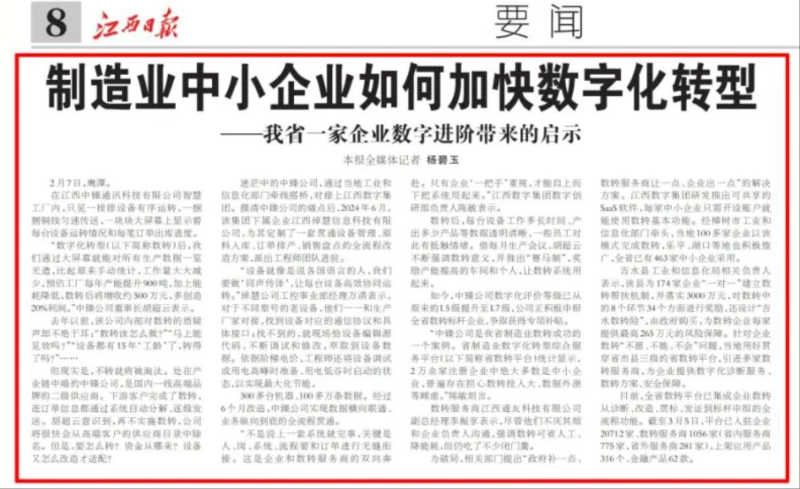2025年是我省推进制造业数字化转型的关键一年,制造业数字化转型是推进新型工业化、建设现代化产业体系的重要举措。近日,江西日报要闻版头条报道江西数字集团建设运营的江西省制造业数字化转型综合服务平台助力全省制造业数字化转型成效。